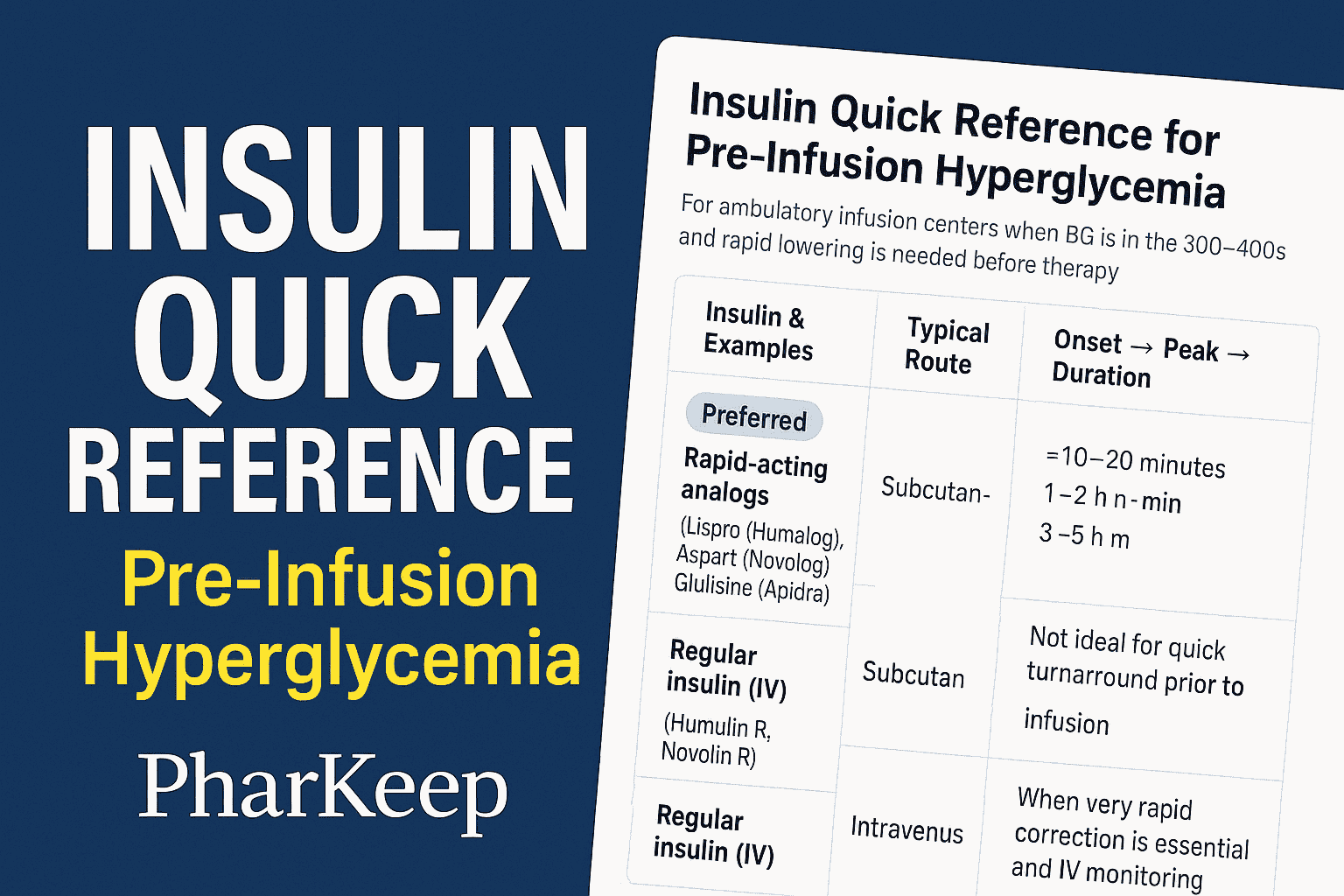 Pharmacists in infusion centers often encounter patients presenting with markedly elevated blood glucose—sometimes in the 400 mg/dL range—prior to receiving chemotherapy, biologics, or other infusion medications. Since hyperglycemia can increase risks during treatment, lowering blood glucose to a safe threshold is often necessary before proceeding. Choosing the appropriate insulin formulation is a critical clinical decision that directly impacts safety, timing, and patient outcomes.